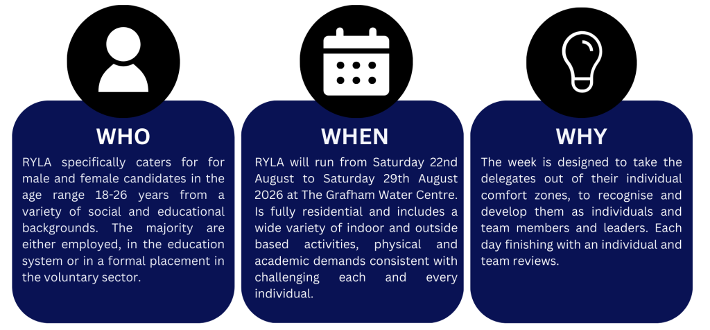 RYLA gives young people the opportunity to expand their horizons by developing team work and team building experience, increasing self-confidence, in addition to obtaining new skills and developing old ones, and returning a young person with enhanced attributes to benefit their current or future employer. Participants learn to work effectively as part of a team, discover the benefits of delegation, discover unexplored individual skills and work to tight deadlines individually and within a team framework.